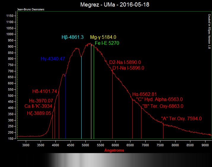 J’ai donc tenté l’expérience de les identifier en spectroscopie à l'aide d'une caméra ASI120MM et un SA-200 dans roue à filtres. Avec le logiciel Rspec, le mode vidéo permet de faire le mise au point "live" sur les raies qui nous intéressent. L'ajustement du gain et du temps de pose devient alors important pour ne pas "surexposer" l'étoile et les raies. J'ai donc travaillé et traité comme en photos planétaires pour finalement obtenir une image. Le reste du travail consistait à reconnaître les raies spectrales et faire une bonne calibration.
