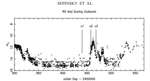 Ce qui rend RX AND particulière, c’est qu’en plus de ses périodes cycliques de 13 à 14 jours. Elle est aussi une étoile qui a des comportements entre Z CAM et VY SCL. Elle accuse donc en plus de ses périodes, des temps d’arrêt et des périodes de stabilités ce qui en fait un sujet d’étude et de suivi parfois très intéressant. (https://www.aanda.org/articles/aa/pdf/2002/10/aaea021.pdf)